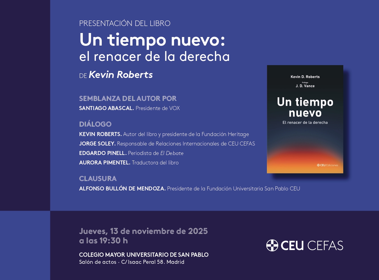 El jueves 13 de noviembre a las 19:30 horas presentamos el libro Un tiempo nuevo: el renacer de la derecha, del presidente del think tank conservador más importante de Estados Unidos «The Heritage Foundation», Kevin Roberts, prologado por el vicepresidente de los Estados Unidos, J. D. Vance, y editado por CEU Ediciones.